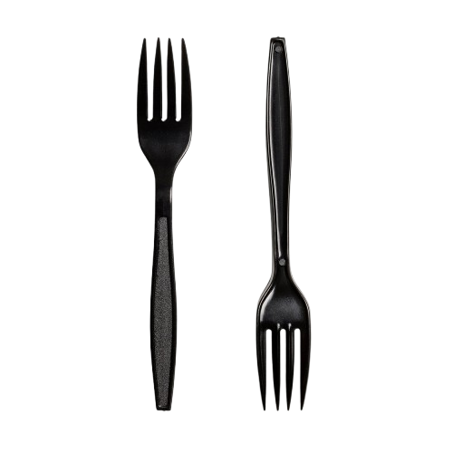 Durable black reusable forks made from strong PS plastic, designed for repeated use in food service environments.