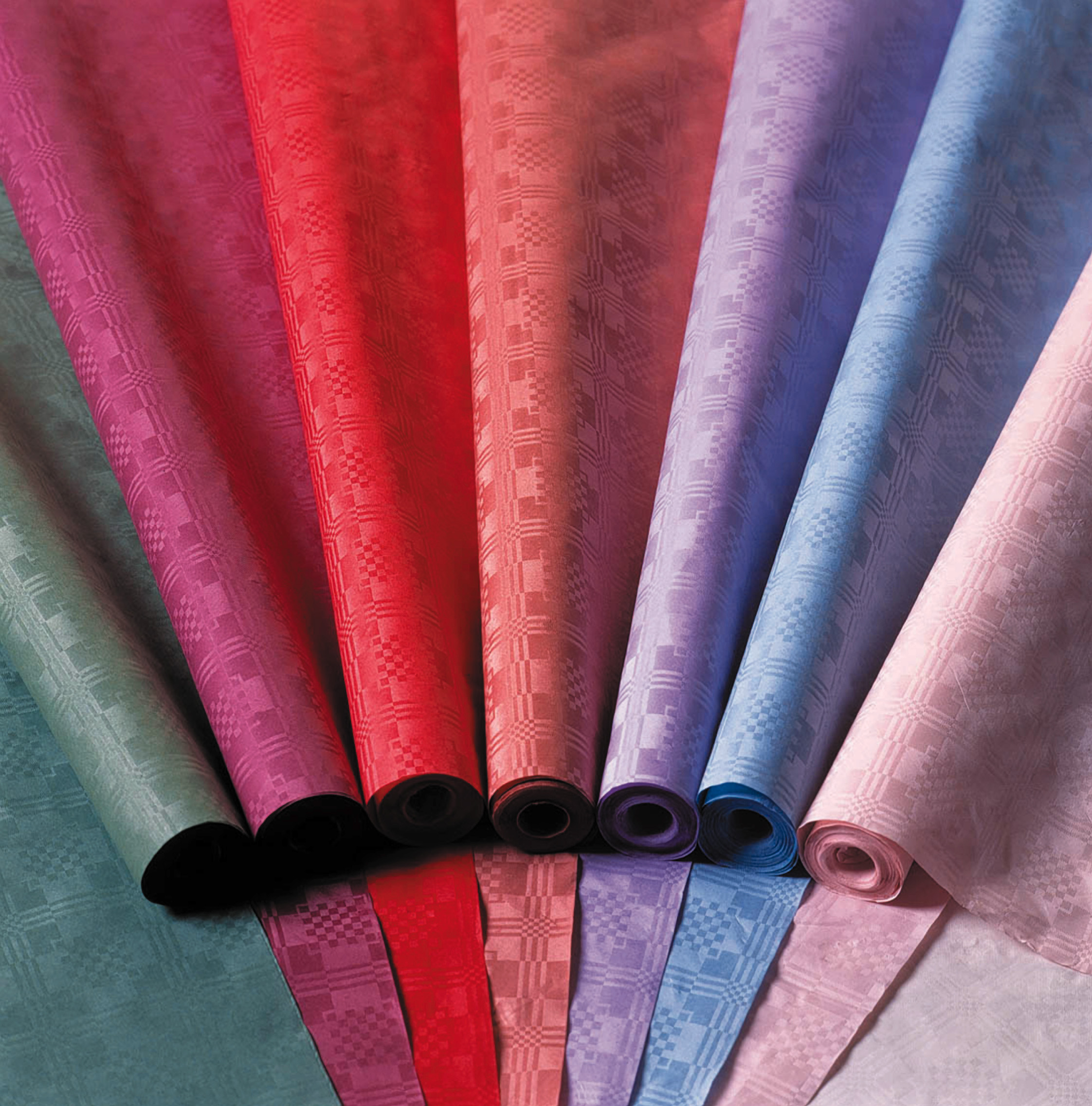 90cm x 90cm paper tablecloths, manufactured from bleached kraft paper with a heavy damask steam embossed design, completely biodegradeable. Flat-packed tablecloths offer superior crease-free presentation in any environment.